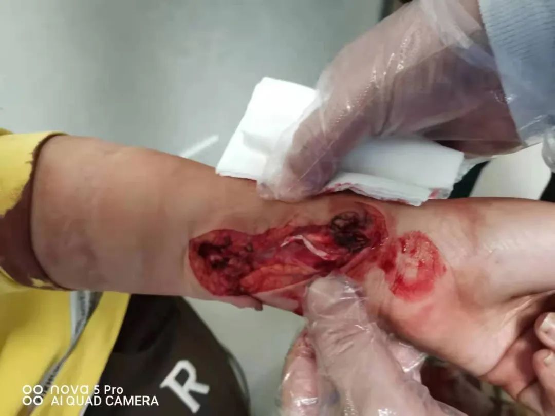 4月19日中午,急促的電話鈴聲響徹在急診室,電話的另一端傳來急切的語氣:一位12歲的小女孩,不小心被玻璃劃破了手臂,傷口深至肌腱,需要馬上進行診治!急診救護車第一時間前往患者家中并同時聯(lián)系了骨科主任,骨科呂國福主任接到電話后,立即帶領骨科團隊,嚴格按照院感防控措施做好防護,到達急診做好接診準備。