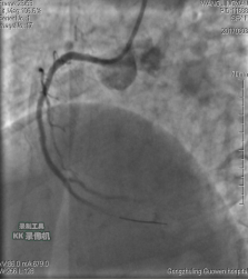 3月3日14時30分:經(jīng)右橈動脈行冠脈造影見:左主干未見明顯異常,TIMI血流3級,前降支開口正常,近中段20%狹窄,TIMI血流3級;回旋支開口正常,中遠段75%狹窄,TIMI血流3級。右冠狀動脈開口正常,中段長病變,最重99%狹窄, TIMI血流3級。