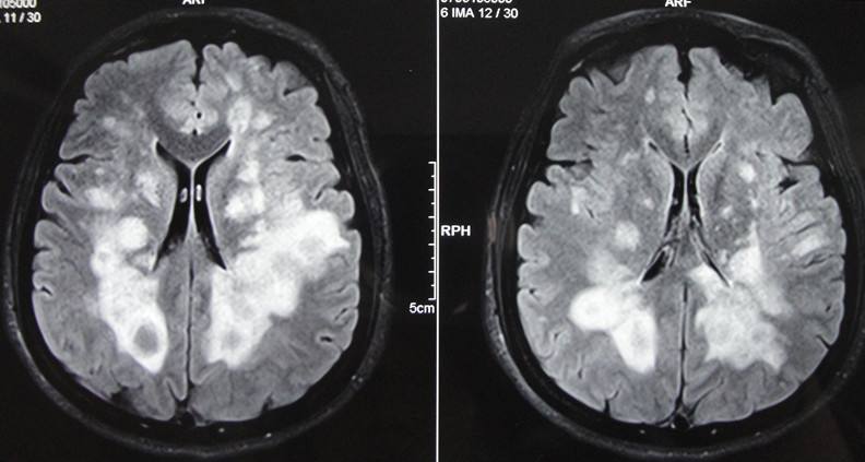 患者,男,李XX,41歲,家住本市,該患于入院前2年,無明顯誘因出現(xiàn)右側(cè)肢活動不靈,表現(xiàn)為走路時腿拖拽,伴有言語不利,尚可與人交談,在“吉林大學(xué)第一醫(yī)院二部”行頭部MRI及腰椎穿刺檢查后診斷為“脫髓鞘病”,治療后好轉(zhuǎn)出院,20天前患者癥狀加重,并伴有左側(cè)肢活動不靈,癥狀無緩解,未予任何治療來我院就診,病程中患者有視物雙影,飲食、睡眠尚可,尿便正常。查體:體溫36.5℃,脈搏71次/分,呼吸18次/分,血壓140/80mmHg,神志清楚,言語不利,查體合作,計算力、記憶力、定向力、理解力、判斷力正常,雙側(cè)額紋對稱,雙側(cè)瞳孔等大同圓,直徑約3.0mm,對光反射靈敏,雙眼各向運動正常,無眼球震顫,無鼻唇溝變淺,伸舌居中,懸雍垂居中,雙側(cè)咽反射靈敏,右側(cè)肢體肌力3級,左側(cè)肢體肌力4級,肌張力增高,膝腱反射亢進(jìn),雙側(cè)Babinski征(+),頸無抵抗 ,雙側(cè)Kernig征(-),昂伯士征(+),雙側(cè)肢體深、淺感覺未見異常,雙肺呼吸音清,心率71次/分,節(jié)律規(guī)整,各瓣膜聽診區(qū)未聞及雜音,腹平軟,無壓痛,肝脾肋下未觸及,雙下肢無浮腫。入院后行頭部、頸椎、胸椎MRI:脫髓鞘病病史: 雙側(cè)側(cè)腦室后角、下角旁、放射冠及半卵圓中心、胼胝體見片狀及團塊狀異常信號影,T1WI呈低信號,T2WI及FLAIR呈高信號;各腦室、腦池大小形態(tài)未見明顯異常,中線結(jié)構(gòu)居中,矢狀面掃描示垂體大小形態(tài)正常。彌散成像腦質(zhì)未見明顯異常高信號影。頸椎生理曲度變直,部分椎體邊緣骨質(zhì)增生。C3/4、C4/5、C5/6間盤向后方局限性突入,硬膜囊前緣受壓。黃韌帶未見明顯增厚。頸髓未見明顯異常信號影。 胸椎生理曲度尚可,椎體骨質(zhì)結(jié)構(gòu)完整。各胸椎間盤未見明顯突出或膨出,黃韌帶無增厚。約T2、5、12椎體水平脊髓內(nèi)見條片狀長T2信號影。心電圖示:竇性心律,心率71次/分,大致正常心電圖。此次考慮患者脫髓鞘病復(fù)發(fā),經(jīng)過吉大一院劉群教授會診后,給予激素大劑量沖擊治療,病程中激素逐漸減量,經(jīng)過一個療程的治療,患者癥狀較前明顯好轉(zhuǎn),肢體活動較前靈活,患者滿意的出了院。