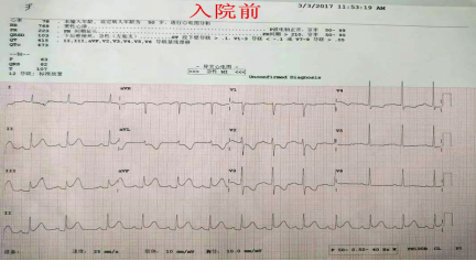 12時(shí)45分心電圖示:竇性心律,心率78次/分,II、III、avF導(dǎo)聯(lián)ST段弓背向上抬高,V1-V5導(dǎo)聯(lián)ST段壓低,不正常心電圖。