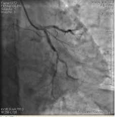 3月3日14時(shí)30分:經(jīng)右橈動(dòng)脈行冠脈造影見(jiàn):左主干未見(jiàn)明顯異常,TIMI血流3級(jí),前降支開(kāi)口正常,近中段20%狹窄,TIMI血流3級(jí);回旋支開(kāi)口正常,中遠(yuǎn)段75%狹窄,TIMI血流3級(jí)。右冠狀動(dòng)脈開(kāi)口正常,中段長(zhǎng)病變,最重99%狹窄, TIMI血流3級(jí)。