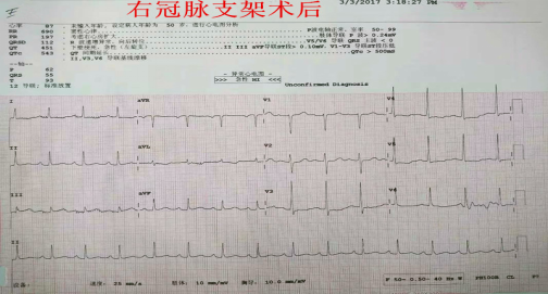 患者冠脈支架植入術(shù)后,胸骨后疼痛癥狀明顯好轉(zhuǎn),復(fù)查心電圖抬高的ST段回降。