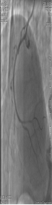 于6月2日下午行手術(shù),術(shù)中可見左冠狀動脈開口正常,左主干短,TIMI血流3級。前降支開口正常,近中段彌漫性病變40%狹窄,遠段閉塞,自身形成側(cè)支循環(huán);回旋支開口正常,近段75%狹窄,鈍緣支未見明顯異常,TIMI血流3級,回旋支遠段次全閉塞。右冠狀動脈開口正常,近中段彌漫性病變,85%-95%狹窄,TIMI血流2級,遠段閉塞。于右冠脈狹窄病變處植入2枚支架。(圖片1、2)