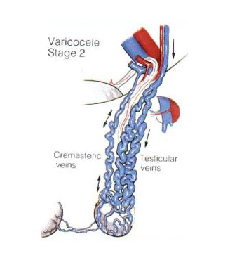 精索靜脈曲張得到很多人關注的原因是,它常常會伴有睪丸萎縮和精子生成障礙,嚴重情況下會導致不育。目前對重度的精索靜脈曲張的治療以手術為主,主要采用精索內(nèi)靜脈高位結(jié)扎術。下圖為精索靜脈曲張II度示意圖:
