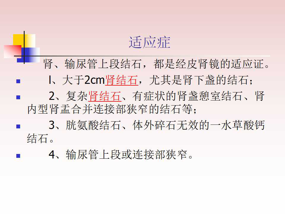 腎、輸尿管上段結(jié)石,都是經(jīng)皮腎鏡的適應(yīng)證:1、大于2cm腎結(jié)石,尤其是腎下盞的結(jié)石; 2、復(fù)雜腎結(jié)石、有癥狀的腎盞憩室結(jié)石、腎內(nèi)型腎盂合并連接部狹窄的結(jié)石等; 3、胱氨酸結(jié)石、體外碎石無效的一水草酸鈣結(jié)石。 4、輸尿管上段或連接部狹窄。