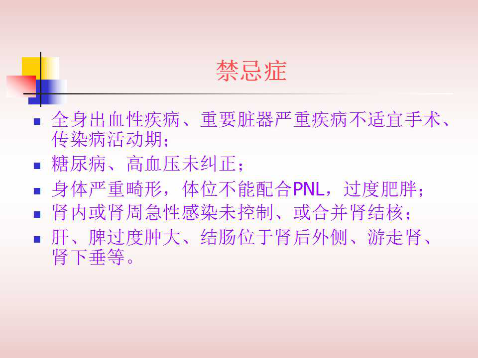 經(jīng)皮腎鏡取石術(shù)的優(yōu)勢: ①與開放手術(shù)相比,經(jīng)皮腎鏡取石術(shù)具有損傷小、痛苦輕、取石徹底、恢復(fù)快等優(yōu)點(diǎn)。腰部的切口通常小于1cm,因?yàn)椴磺虚_肌肉,因此不但不影響美觀,而且手術(shù)后對勞動(dòng)力幾乎沒有影響。②與腹腔鏡取石相比,經(jīng)皮腎鏡取石術(shù)對腎臟及周圍的結(jié)構(gòu)影響小,不影響以后的各種腎臟手術(shù)。③與體外碎石相比,它的治療周期短、效果立竿見影,對腎功能的影響也較小。其禁忌癥為:全身出血性疾病、重要臟器嚴(yán)重疾病不適宜手術(shù)、傳染病活動(dòng)期;糖尿病、高血壓未糾正;身體嚴(yán)重畸形,體位不能配合PNL,過度肥胖;腎內(nèi)或腎周急性感染未控制、或合并腎結(jié)核;肝、脾過度腫大、結(jié)腸位于腎后外側(cè)、游走腎、腎下垂等。