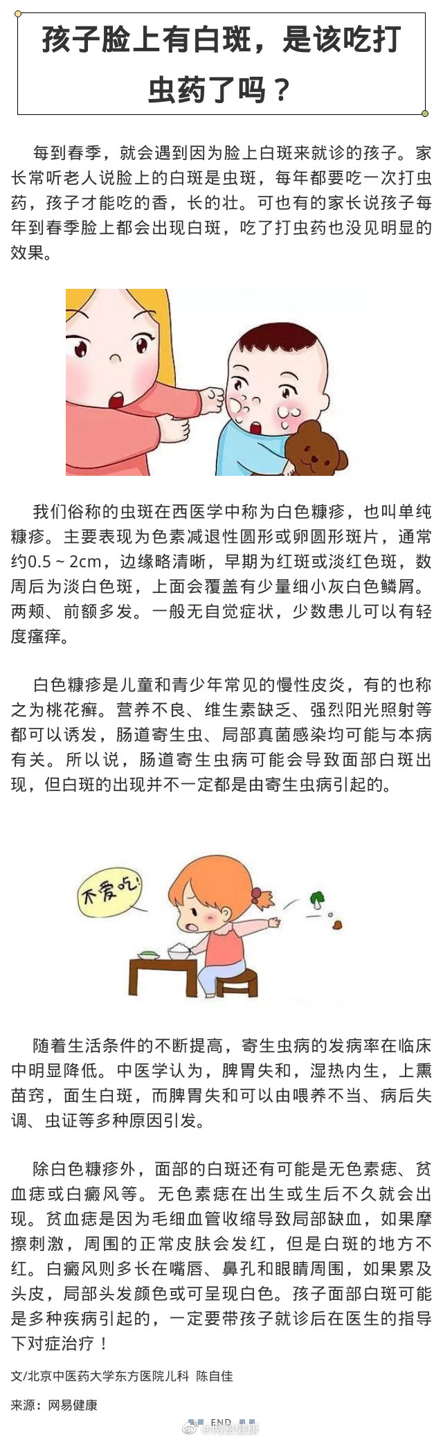 每到春季,不少孩子臉上都開始長白斑。常聽老人說臉上的白斑是蟲斑,每年都要吃一次打蟲藥,孩子才能吃的香,長的壯??梢灿屑议L說孩子每年到春季臉上都會出現(xiàn)白斑,吃了打蟲藥也沒見明顯的效果。這些白斑到底是什么?什么原因引起的?又該如何治療呢?