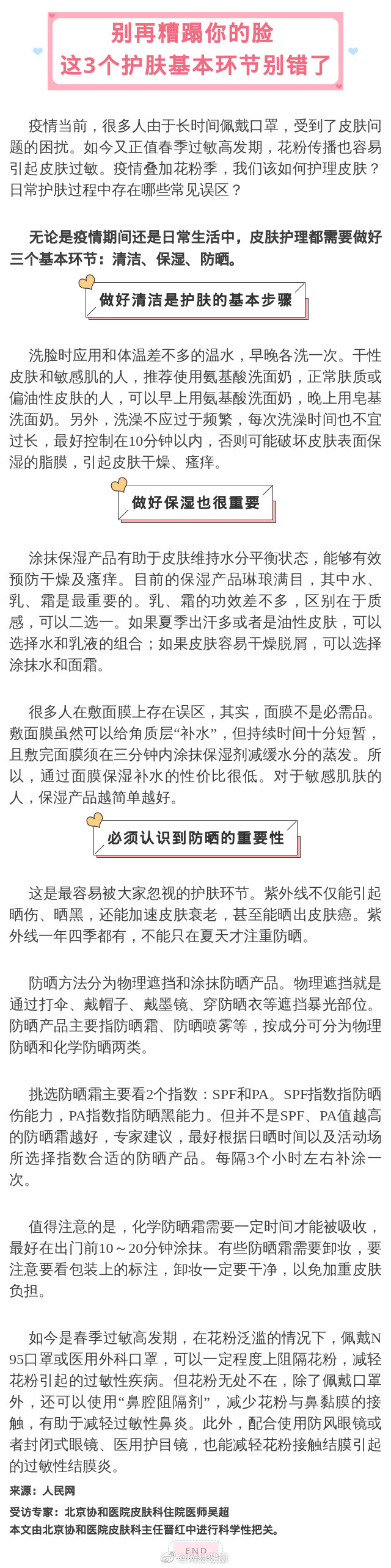 疫情當前,很多人由于長時間佩戴口罩,受到了皮膚問題的困擾。如今又正值春季過敏高發(fā)期,花粉傳播也容易引起皮膚過敏。疫情疊加花粉季,我們該如何護理皮膚?日常護膚過程中存在哪些常見誤區(qū)?