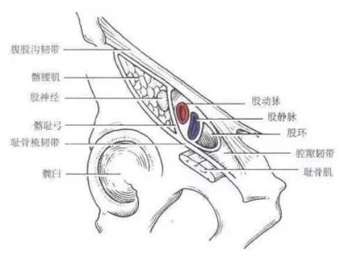 臟器或組織經(jīng)股環(huán)突入股管,再經(jīng)股管突出卵圓窩,稱(chēng)為股疝(femoral hernia)。從這個(gè)定義中,我們可以看到數(shù)個(gè)解剖結(jié)構(gòu),因此若想熟知股疝,必須先從解剖下手。