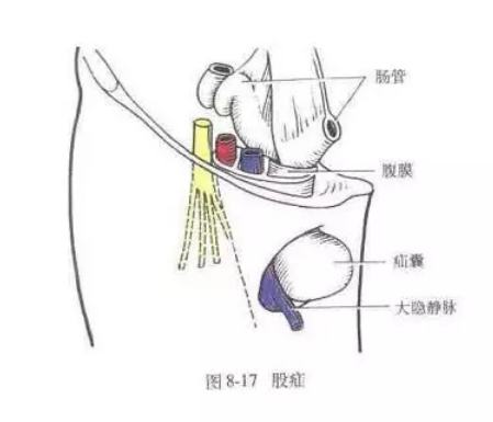 示意圖顯示右側(cè)股疝,注意疝囊路徑以及與股靜脈、股動(dòng)脈的位置關(guān)系