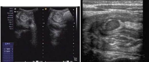 1、腸套疊部位顯示邊界清楚的包塊。其橫斷面呈大環(huán)套小環(huán)的特征性表現(xiàn),即“同心圓征”或“靶環(huán)征”。外圓呈均勻的低回聲環(huán)帶,系鞘部腸壁回聲,低回聲帶系水腫增厚的反折壁及其與鞘部之間的少量腸內(nèi)液體形成。在大的外圓內(nèi),又有一個(gè)小低回聲環(huán)帶,形成內(nèi)圓。內(nèi)、外圓間為高回聲環(huán),中心部為高回聲團(tuán),其邊緣欠光整。套疊部的縱斷面呈“套筒征”或“假腎征”。有時(shí)可能顯示套疊的頂部和頸部,頂部呈指頭狀盲端。“假腎征”通常是在套疊時(shí)間較長(zhǎng),腸壁發(fā)生嚴(yán)重水腫時(shí)出現(xiàn),或是成人患者存在腸管腫瘤或息肉時(shí)出現(xiàn)。