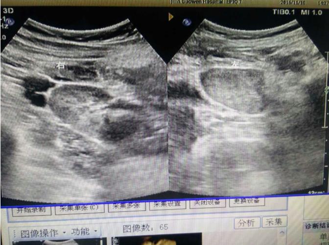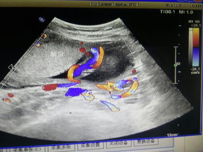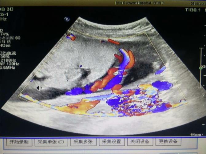為該患常規(guī)檢查臍帶入口時(shí)發(fā)現(xiàn)臍帶入口位于胎盤下緣邊緣,胎兒超聲檢查無陽性發(fā)現(xiàn)。常規(guī)掃查右卵巢時(shí),發(fā)現(xiàn)右卵巢旁可見腎臟回聲(正常情況下,右卵巢旁是不會(huì)掃查到腎臟回聲的),大小、形態(tài)如常,CDFI:腎內(nèi)血流灌注尚可,故囑患者左側(cè)臥位,顯示孕婦右腎位置、大小及形態(tài)正常,囑孕婦右側(cè)臥位,發(fā)現(xiàn)脾臟下方無腎臟回聲,故考慮該患左腎游走腎。該患于2016年12月2日復(fù)查,結(jié)果如前。