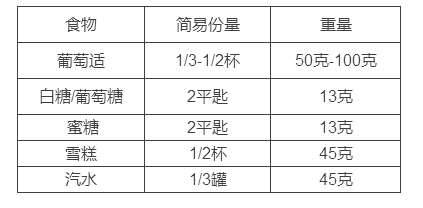 如遇到低血糖現象:出冷汗、手震、頭暈、四肢軟弱無力、神志不清,心跳加速或饑餓難忍,此時可選用一份純糖食物,以下食物每項含約10克糖質或進食2-3粒糖果,糖膠,果醬等均可較快地提升血糖。