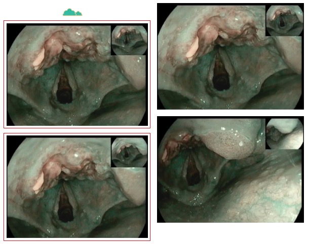 這時(shí),3診是一位懷疑食管瘺的患者,進(jìn)鏡至距門(mén)齒約25cm見(jiàn)食管管腔狹窄明顯,無(wú)法繼續(xù)進(jìn)鏡,狹窄處黏膜粗糙、色紅,可見(jiàn)潰瘍形成。嘗試給予胃營(yíng)養(yǎng)管置入,插至距門(mén)齒約35cm處阻力過(guò)大,反復(fù)嘗試后,無(wú)法留置。