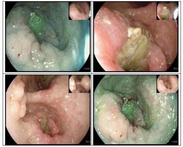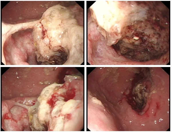走進(jìn)6診,是一位71歲急診檢查的患者,患者胃內(nèi)大量食物潴留,視野欠清,胃竇及幽門(mén)見(jiàn)一不規(guī)則環(huán)形腫物,腫物表面污穢不平,管腔狹窄,內(nèi)鏡無(wú)法通過(guò),胃竇前壁見(jiàn)約1.5*1.2cm丘狀隆起,中央凹陷。內(nèi)鏡醫(yī)生陳大夫給予病理活檢,待病理結(jié)果出來(lái)行進(jìn)一步治療。