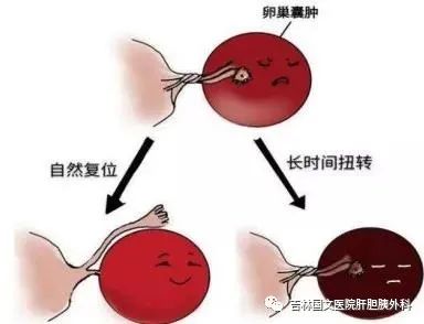 蒂扭轉(zhuǎn)是畸胎瘤較常見的并發(fā)癥,為婦科急腹癥之一。卵巢腫瘤的蒂發(fā)生急性扭轉(zhuǎn)后,靜脈回流受阻,瘤內(nèi)高度充血或血管破裂,致使瘤體急劇增大,瘤內(nèi)出血,最后動脈血流受阻,腫瘤發(fā)生壞死變?yōu)樽虾谏灼屏押屠^發(fā)感染。