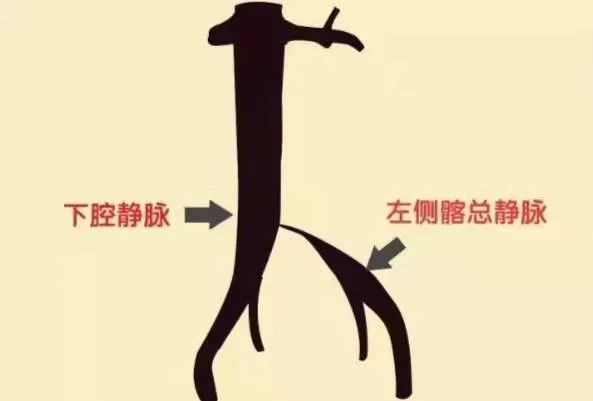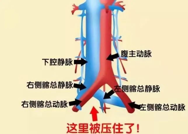 有個特別地方,動脈和靜脈互相擠壓,卻可能會引起問題:下腔靜脈位于腹主動脈右側(cè),腹主動脈發(fā)出的右髂總動脈在左側(cè)髂總靜脈的前方,因此左髂總靜脈會受到前方的右髂總動脈和后方骨骼的夾擊。