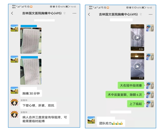到達(dá)附近醫(yī)院時胸痛的癥狀愈加強(qiáng)烈,甚至連說話的力氣都沒有了。接診的是一個有經(jīng)驗(yàn)的資深醫(yī)生,立即意識到他病情的嚴(yán)重性。首先為其做了心電圖,結(jié)果不出所料,診斷為急性下壁心肌梗死,三度房室傳導(dǎo)阻滯(致命性的心律失常),心源性休克。這可是心血管內(nèi)科的急重癥,對患者來說隨時都有致命生命危險(xiǎn),由于所處醫(yī)院不具備胸痛病人救治能力,醫(yī)生建議他馬上到我院胸痛中心進(jìn)行就診,盡快做造影開通血管,于是醫(yī)生立刻通過區(qū)域內(nèi)胸痛救治微信群與我院胸痛中心取得聯(lián)系,我院胸痛中心接到通知后,立即提前做好救治病人準(zhǔn)備。