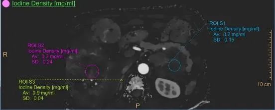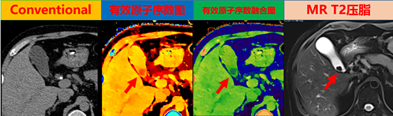 陰性結(jié)石的有效原子序數(shù)為6.61,而膽汁的有效原子序數(shù)為7.29,通過MR檢查證實病變?yōu)槟懩翌i部結(jié)石