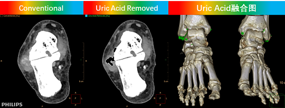 尿酸移除圖顯示尿酸鹽結(jié)晶的沉積范圍,尿酸融合VR圖直觀顯示痛風(fēng)石解剖定位。