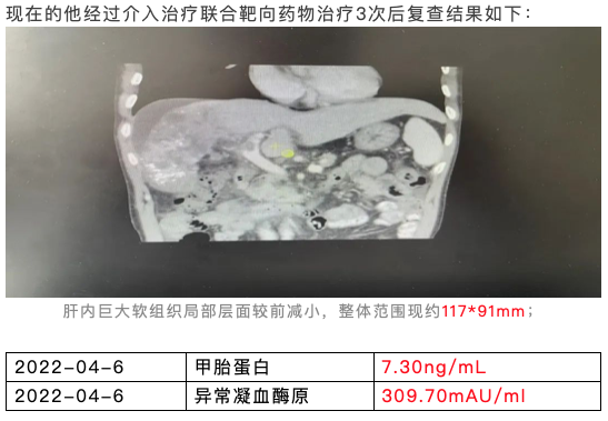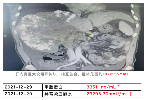 在我院通過肝臟CT平掃+增強(qiáng)顯示結(jié)果為:肝內(nèi)見巨大軟組織腫塊,相互融合,整體范圍約197x135mm;腫瘤標(biāo)記物:甲胎蛋白5360.1ng/mL↑,異常凝血酶原35486.30mAU/mL↑。腫塊在不斷擴(kuò)大,病情不容樂觀,在完善相關(guān)檢查后,醫(yī)生于2021年12月20日在局麻下行TACE聯(lián)合HAIC治療并囑患者抗病毒及口服“侖伐替尼”治療。并于12月29日進(jìn)行術(shù)后復(fù)查: