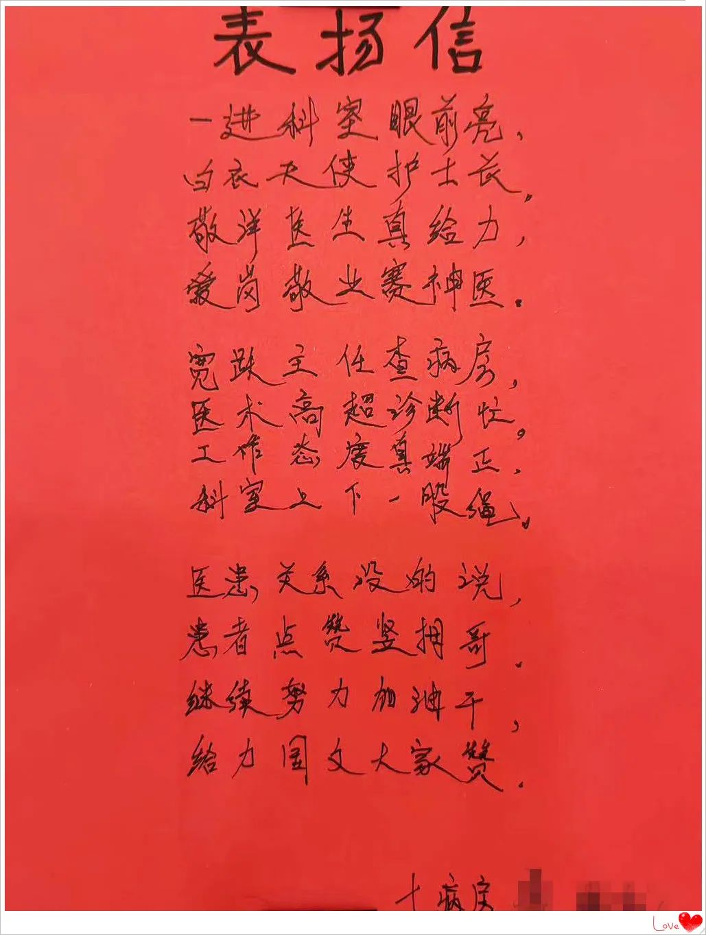 “我是宋主任多年的老患者”“這次在國文中醫(yī)科住院”“醫(yī)護(hù)們的服務(wù)讓我感到很暖心”“宋主任的頭針技術(shù)更是沒得說”“讓我身上這些癥狀得到明顯改善”“我對整個治療過程很滿意”即將出院的田先生特別激動地說,為表對中醫(yī)科宋寬躍主任團(tuán)隊(duì)的感謝,他特別寫了一首感謝詩贈與中醫(yī)科團(tuán)隊(duì),小愛匯聚大愛,對患者來說,點(diǎn)滴關(guān)懷,溫暖珍貴,國文醫(yī)院中醫(yī)科守正創(chuàng)新,始終堅(jiān)持一切以病人為中心。懷揣對生命的敬畏,在人文關(guān)懷和服務(wù)態(tài)度上,“急患者之所急,想患者之所想”,時(shí)刻為百姓生命健康保駕護(hù)航。