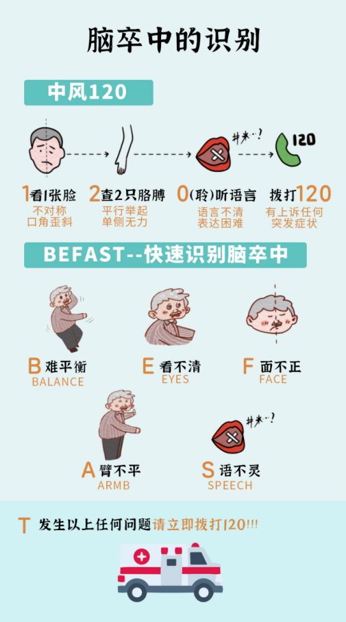 專家提醒:腦卒中發(fā)病急、進(jìn)展快,一旦出現(xiàn)以下癥狀,請立即撥打120急救電話:* 突發(fā)一側(cè)肢體無力或麻木* 突發(fā)口角歪斜、流口水* 突發(fā)言語不清或理解語言困難* 突發(fā)單眼或雙眼視力模糊* 突發(fā)眩暈、嘔吐、行走不穩(wěn)* 突發(fā)劇烈頭痛。