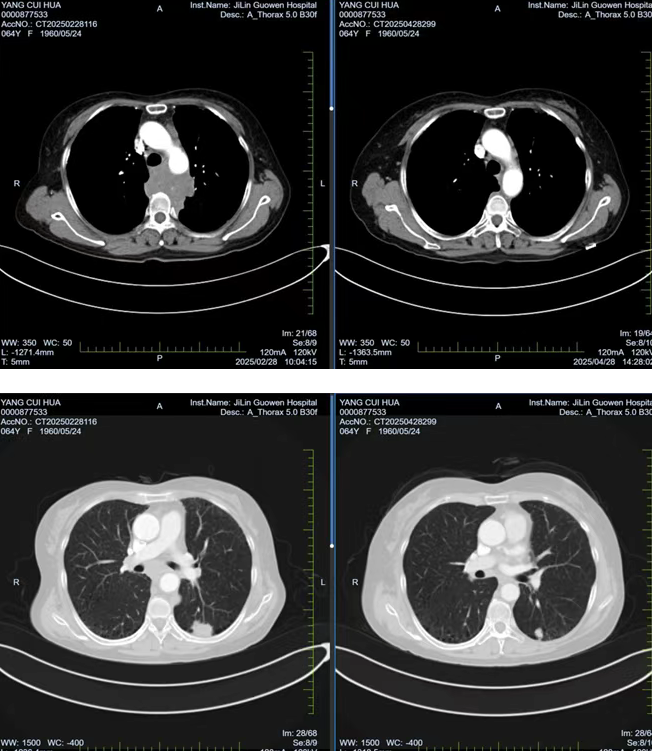 經(jīng)過 1 周期的免疫聯(lián)合化療后,患者的胸背部疼痛逐漸減輕,目前患者疼痛癥狀已得到改善,生活質(zhì)量得到了顯著提升。