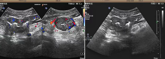 轉診至我院后,腸鏡檢查有了重要發(fā)現(xiàn) —— 王女士腸道內(nèi)存在不規(guī)則腫物,腫物表面出現(xiàn)潰爛出血的情況,還導致了腸腔狹窄。這一發(fā)現(xiàn)讓病情的排查有了方向,隨后超聲科接診,立即啟動重點探查,力求更精準地了解病變情況。