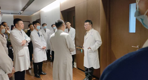 之后,季加孚教授來到了胃腸外科療區(qū),察看了醫(yī)生辦公室、示教室、護(hù)士站的布局和使用情況,提出很多寶貴意見。在教學(xué)式查房過程中,會(huì)診兩名胃癌術(shù)后患者,精準(zhǔn)明確了后續(xù)診療意見。查房間隙,季加孚教授還與年輕醫(yī)生討論結(jié)直腸外科疑難病例,耐心講解年輕醫(yī)生提出的有關(guān)疑問。