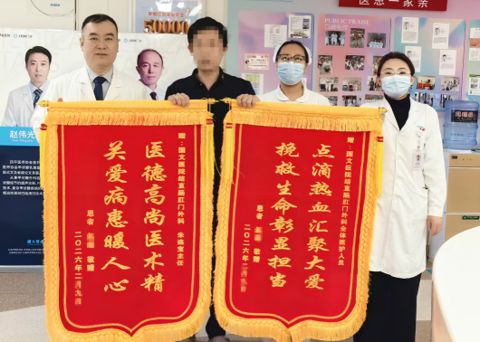近日,國文醫(yī)院結(jié)直腸肛門外科聯(lián)合多學科協(xié)作,成功為胃腸雙重腫瘤患者精準施治,為患者生命點亮希望,得到家屬和患者一致認可,為表達感謝,患者及家屬特意將兩面錦旗鄭重送到醫(yī)護人員手中。錦旗上的鎏金字跡,不僅承載著患者及家屬對科室醫(yī)護人員的深厚敬意,更見證了一段跨越重癥、凝聚醫(yī)患深情的暖心救治之路。