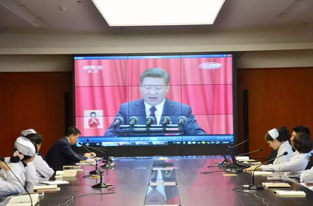 隨后,全體參會人員觀看了習(xí)近平代表第十八屆中央委員會作的題為《決勝全面建成小康社會 奪取新時代中國特色社會主義偉大勝利》的報告,報告總結(jié)過去五年的發(fā)展成果與經(jīng)驗教訓(xùn),提出了未來黨的建設(shè)的目標(biāo)與綱領(lǐng)。