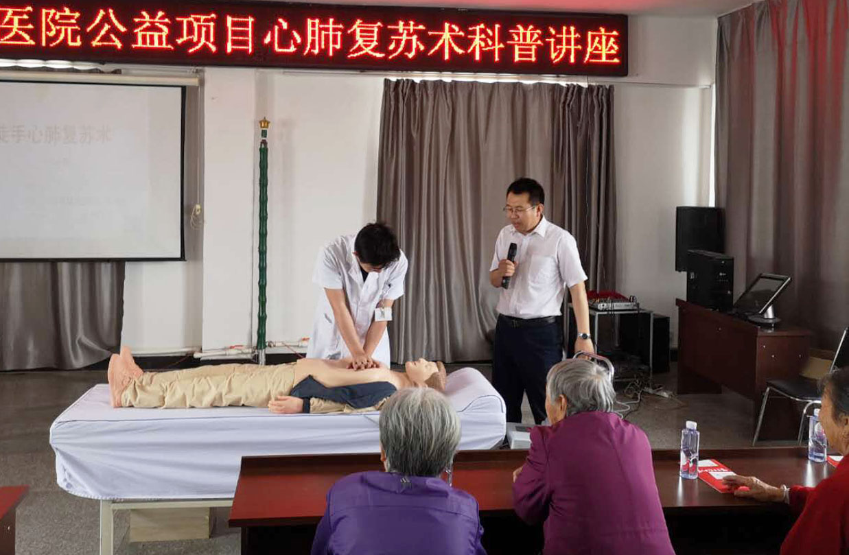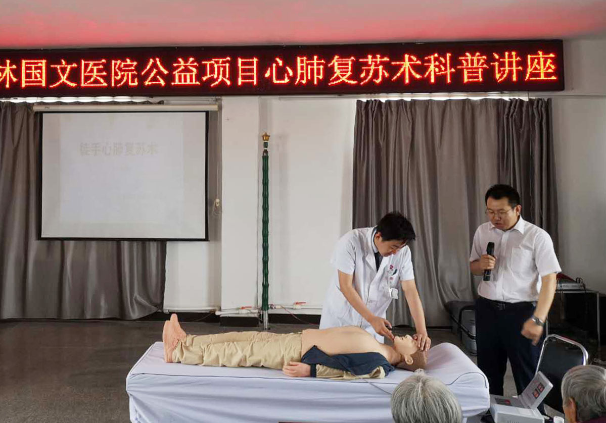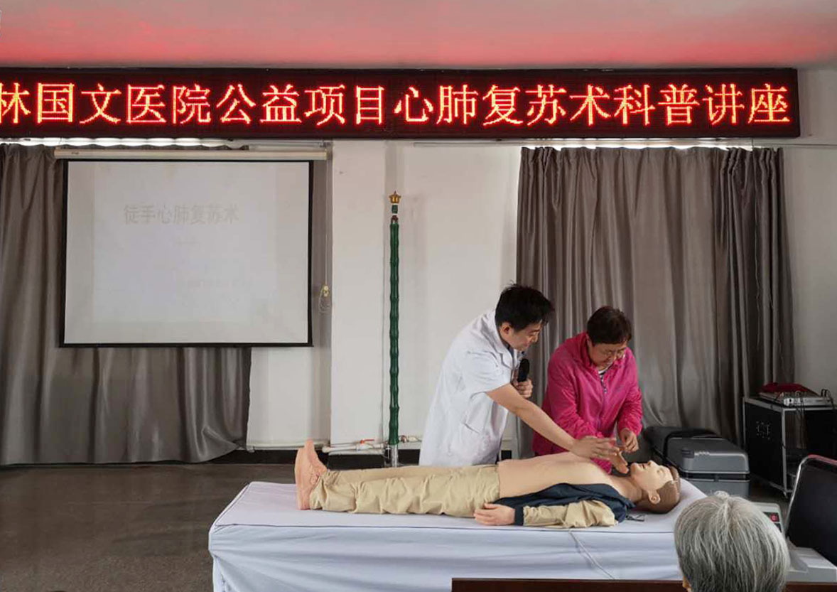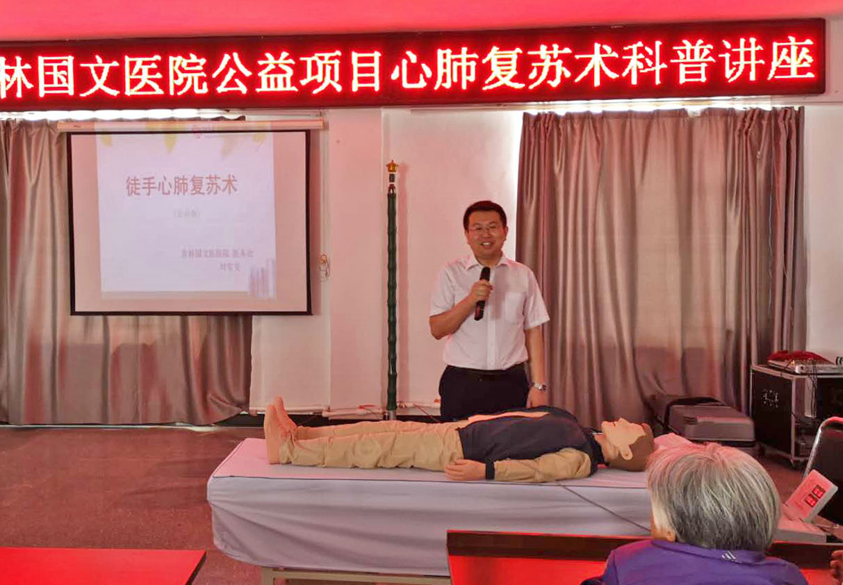 按照吉林國文醫(yī)院黨委發(fā)起醫(yī)務(wù)處承辦的心肺復(fù)蘇公益推廣項(xiàng)目,堅守保護(hù)人的生命和健康的宗旨,5月31日,在吉林國文醫(yī)院醫(yī)務(wù)處組織下,心肺復(fù)蘇項(xiàng)目推廣小組進(jìn)入公主嶺市嶺東街道黃龍社區(qū)開展主題為“國文醫(yī)院心肺復(fù)蘇講座”的公益活動。本次活動為該社區(qū)120余名社區(qū)人員進(jìn)行現(xiàn)場急救知識培訓(xùn),普及應(yīng)急知識。