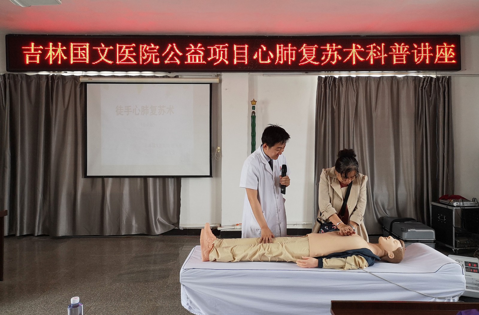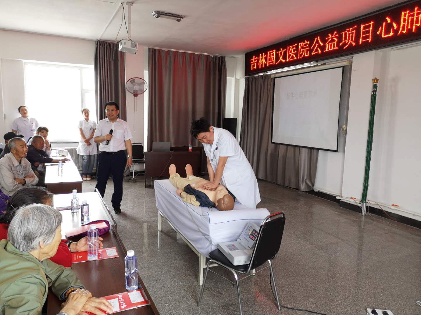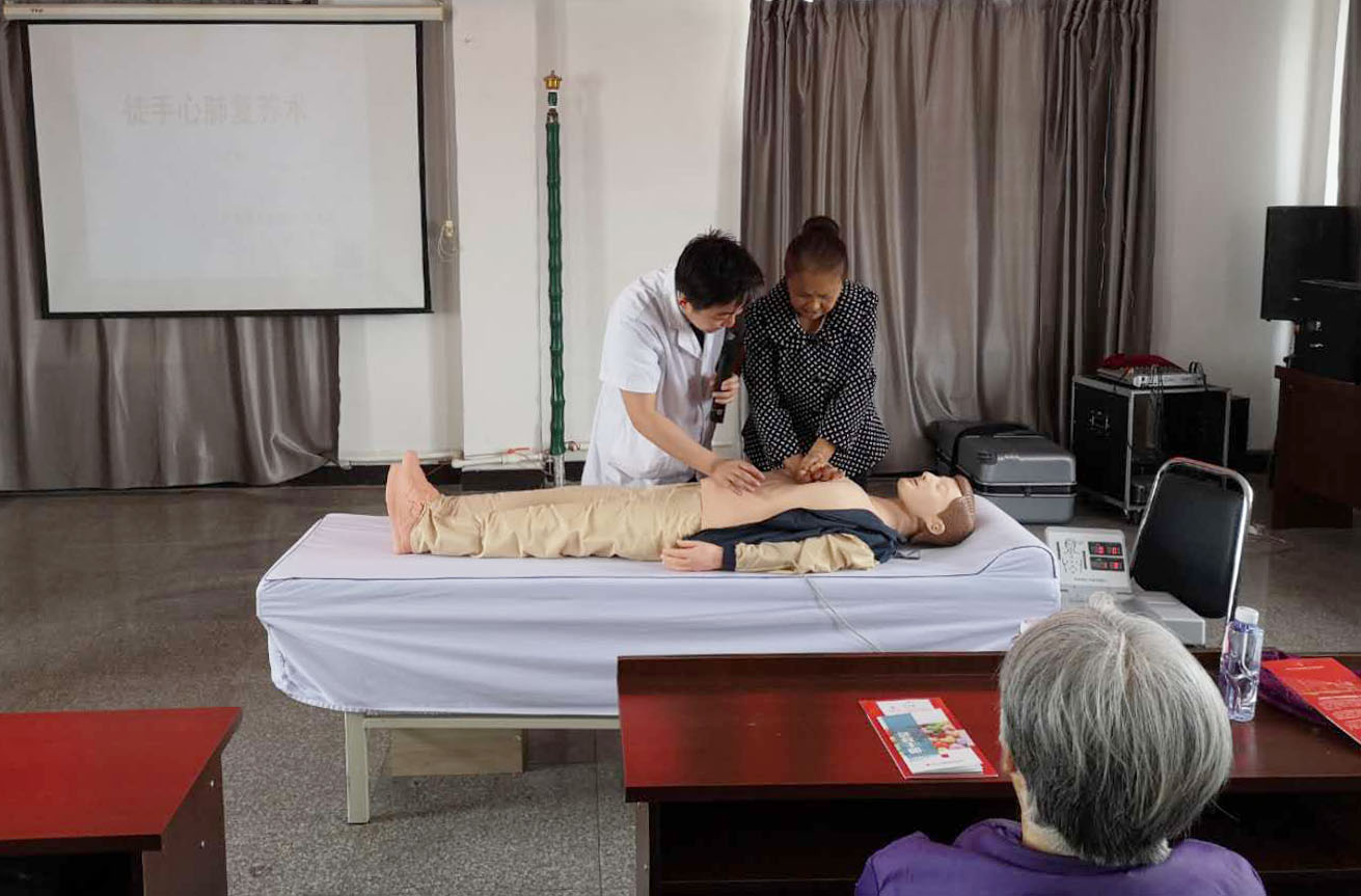 按照吉林國文醫(yī)院黨委發(fā)起醫(yī)務(wù)處承辦的心肺復(fù)蘇公益推廣項(xiàng)目,堅守保護(hù)人的生命和健康的宗旨,5月31日,在吉林國文醫(yī)院醫(yī)務(wù)處組織下,心肺復(fù)蘇項(xiàng)目推廣小組進(jìn)入公主嶺市嶺東街道黃龍社區(qū)開展主題為“國文醫(yī)院心肺復(fù)蘇講座”的公益活動。本次活動為該社區(qū)120余名社區(qū)人員進(jìn)行現(xiàn)場急救知識培訓(xùn),普及應(yīng)急知識。