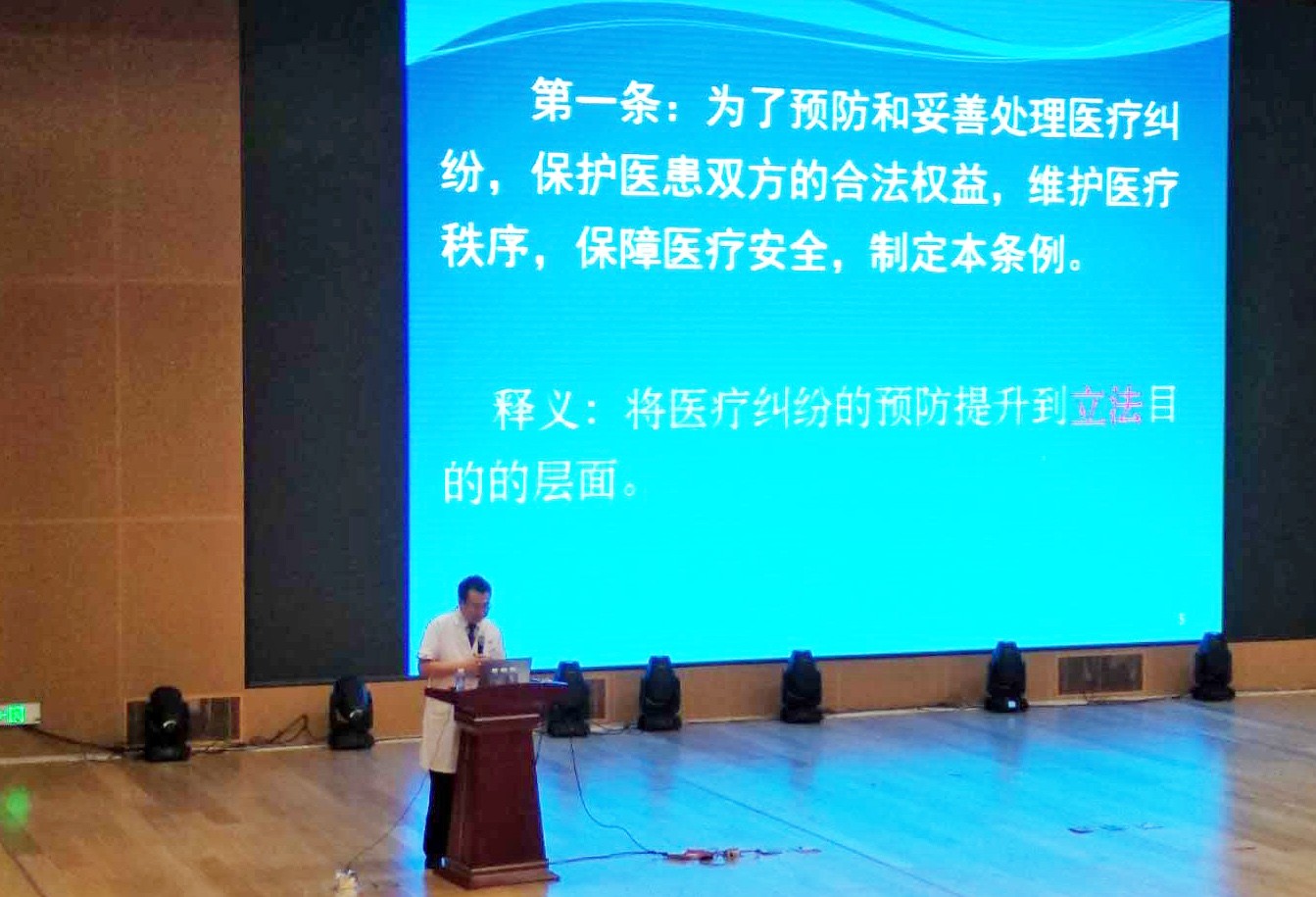 大會第六項議程,為進一步規(guī)范醫(yī)務人員的醫(yī)療行為,預防醫(yī)療風險,保障醫(yī)療安全,由醫(yī)務處劉寶安處長對全體參會醫(yī)師進行了《醫(yī)療糾紛預防和處理條例》專題培訓,培訓會上,劉寶安處長從總則、醫(yī)療糾紛預防、醫(yī)療糾紛處理以及法律責任四個方面,對條例進行了細致、系統(tǒng)的分析和解讀,對條例中有所變化的重點內容進行了強調。重點強調此次出臺的《條例》將預防醫(yī)療糾紛提升到立法層面,對醫(yī)療機構和醫(yī)務人員提出了更高要求,特別是在保障患者的知情權、選擇權方面,對醫(yī)務人員告知的內容、方法、告知的對象等,做了詳細的規(guī)定,從源頭上預防醫(yī)療糾紛的發(fā)生。