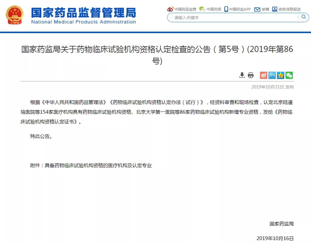 10月31日,國家藥監(jiān)局關于藥物臨床試驗機構資格認定檢查的公告(第5號)(2019年第86號),吉林國文醫(yī)院順利通過了國家藥物臨床試驗機構資格認定(簡稱“GCP資格認定”)證書編號1008。 閱讀量:2414